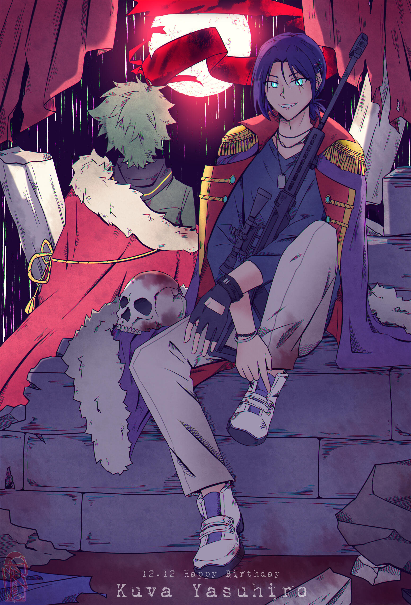 Brash and aggressive with mouth of a sailor. Impulsive, but wth sharp intuition to follow up on his moves. Dislikes a chaotic environment, so if nobody is leading, he takes charge to keep everything and everyone in order. In combat, he is as silent and as fast as his blades. He deals with problems and enemies with lethal efficiency.Now in his peaceful life, Rakurai's explosive temper has mellowed down. He doesn't yell as much but still ends up cursing. His usually glaring expression only hides the fact that he is a curious and healing soul. He is also very much new to affection and struggles to accept and express it.Unfotunately, the ashes of war is still lingering in the corners of his eyes, leaving him with aversion to sudden noise and touches. His senses are still subconsciously high. Only when he is around his loved ones does he let his guard down, and enjoy the moment as it is.